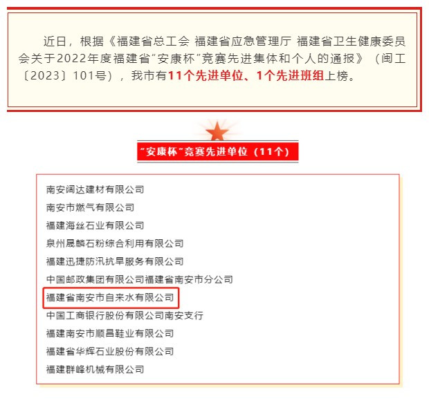 近日,根據(jù)《福建省總工會 福建省應(yīng)急管理廳 福建省衛(wèi)生健康委員會關(guān)于2022年度福建省“安康杯”競賽先進(jìn)集體和個人的通報》(閩工〔2023〕101號),公司榮獲“安康杯”競賽先進(jìn)單位榮譽稱號。